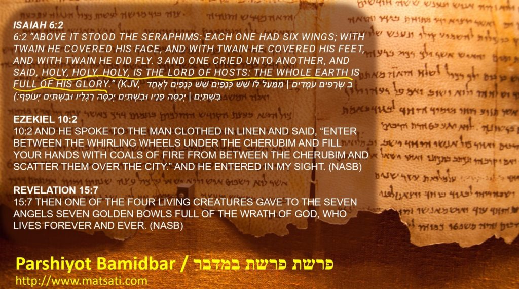 Remember the Hebrew word for Seraphim, שְׂרָפִ֨ים from the root שרף which has meaning “the burning effect from poison” coupled with Isaiah 1:15 (Ezekiel 1:13 וּדְמ֨וּת הַחַיּ֜וֹת מַרְאֵיהֶ֣ם כְּגַחֲלֵי־אֵ֗שׁ בֹּֽעֲרוֹת֙ כְּמַרְאֵ֣ה הַלַּפִּדִ֔ים הִ֕יא מִתְהַלֶּ֖כֶת בֵּ֣ין הַחַיּ֑וֹת וְנֹ֣גַהּ לָאֵ֔שׁ וּמִן־הָאֵ֖שׁ יוֹצֵ֥א בָרָֽק׃ “The appearance of the living creatures was like burning coals of fire or like torches. Fire moved back and forth among the creatures; it was bright, and lightning flashed out of it.”) They fly where God wills them to go (Ezekiel 1:12, 20). They hand out coals of fire, which are the judgments from God (Isaiah 6:6, Ezekiel 10:2). This is how John describes the Living creatures according to Revelation 15:7. We note in Revelation 15:8 the text states “And the temple was filled with smoke from the glory of God and from His power; and no one was able to enter the temple until the seven plagues of the seven angels were finished.” (NASB) These things explain to us how there is a temple in heaven and there were those who went in and out of that temple in heaven. This is the image that God told Moshe to make the earthly copy from the heavenly original. The throne of God appears to be at the center of that temple. All of these things are represented in the wilderness tabernacle over the mercy seat in the holy of holies (Shemot / Exodus 25:18-20), which is said to be the earthly copy representing the throne of God. John’s vision is similar to that of Ezekiel’s, with an interesting variation. John shows the creatures as having six wings and Ezekiel as having four. John is not alone in this difference. Isaiah also recorded these same beings as having six wings. (Isaiah 6:2) Midrash Tanchuma, Emor 16:1 (מדרש תנחומא, אמור ט״ז:א׳) states that it was for the atonement of Israel that He added two more wings to them. Thus it is stated , “each of them had six wings.” (Townsend 1989 translation of Midrash Tanhuma, S. Buber Recension, edited and supplemented by R. Francis Nataf)