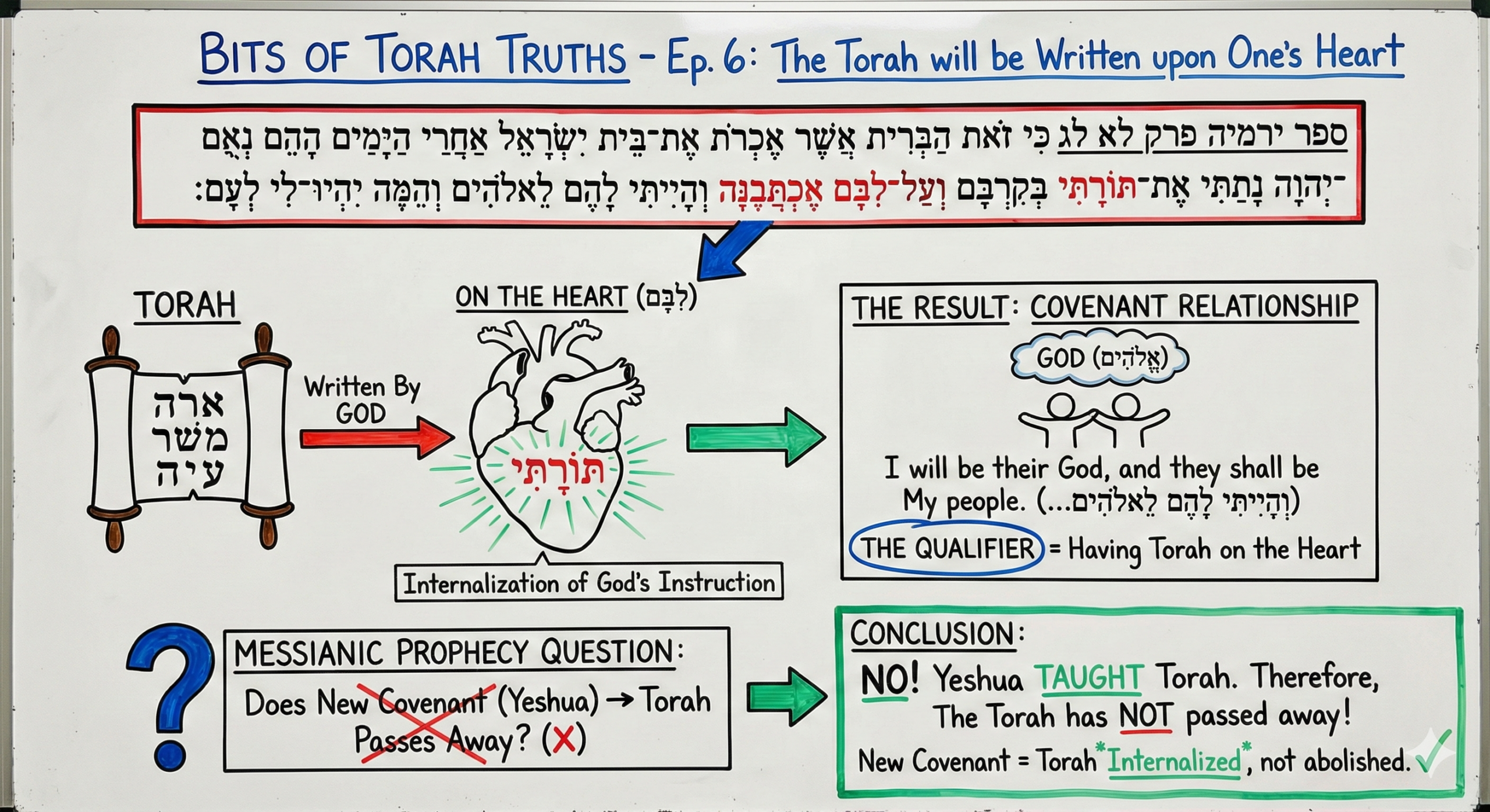 We note how significant this verse is, God says He will write His Torah upon the heart of His people. When this happens he says וְהָיִ֤יתִי לָהֶם֙ לֵֽאלֹהִ֔ים וְהֵ֖מָּה יִֽהְיוּ־לִ֥י לְעָֽם we will be His people and He will be our God. Note the qualifier here is having God’s Torah written upon our heart. If Jeremiah 31:33 is a messianic prophecy, why would the new covenant that we have in Yeshua cause the Torah to be no more?