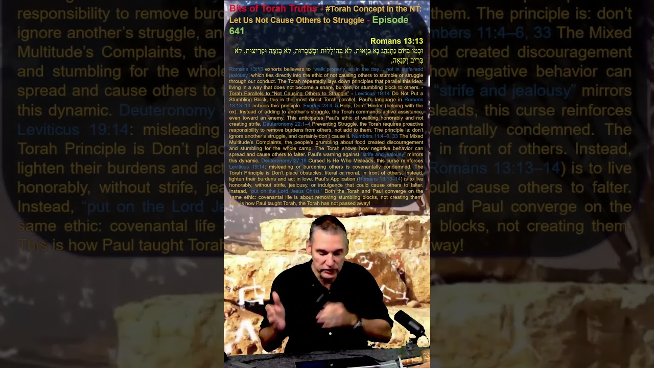 Romans 13:13 exhorts believers to “walk properly, as in the day… not in strife and jealousy” which ties directly into the ethic of not causing others to stumble or struggle through our conduct. The Torah repeatedly lays down principles that parallel this idea: living in a way that does not become a snare, burden, or stumbling block to others. – Torah Parallels to “Not Causing Others to Struggle” – Leviticus 19:14 Do Not Put a Stumbling Block, this is the most direct Torah parallel. Paul’s language in Romans 13:13–14 echoes this principle. Exodus 23:4–5 Help, Don’t Hinder (helping with the ox). Instead of adding to another’s struggle, the Torah commands active assistance, even toward an enemy. This anticipates Paul’s ethic of walking honorably and not creating strife. Deuteronomy 22:1–4 Preventing Struggle, the Torah requires proactive responsibility to remove burdens from others, not add to them. The principle is: don’t ignore another’s struggle, and certainly don’t cause it. Numbers 11:4–6, 33 The Mixed Multitude’s Complaints, the people’s grumbling about food created discouragement and stumbling for the whole camp. The Torah shows how negative behavior can spread and cause others to falter. Paul’s warning against “strife and jealousy” mirrors this dynamic. Deuteronomy 27:18 Cursed Is He Who Misleads; this curse reinforces Leviticus 19:14: misleading or burdening others is covenantally condemned. The Torah Principal is Don’t place obstacles, literal or moral, in front of others. Instead, lighten their burdens and act in love. Paul’s Application (Romans 13:13–14) is to live honorably, without strife, jealousy, or indulgence that could cause others to falter. Instead, “put on the Lord Jesus Christ.” Both the Torah and Paul converge on the same ethic: covenantal life is about removing stumbling blocks, not creating them. This is how Paul taught Torah, the Torah has not passed away!