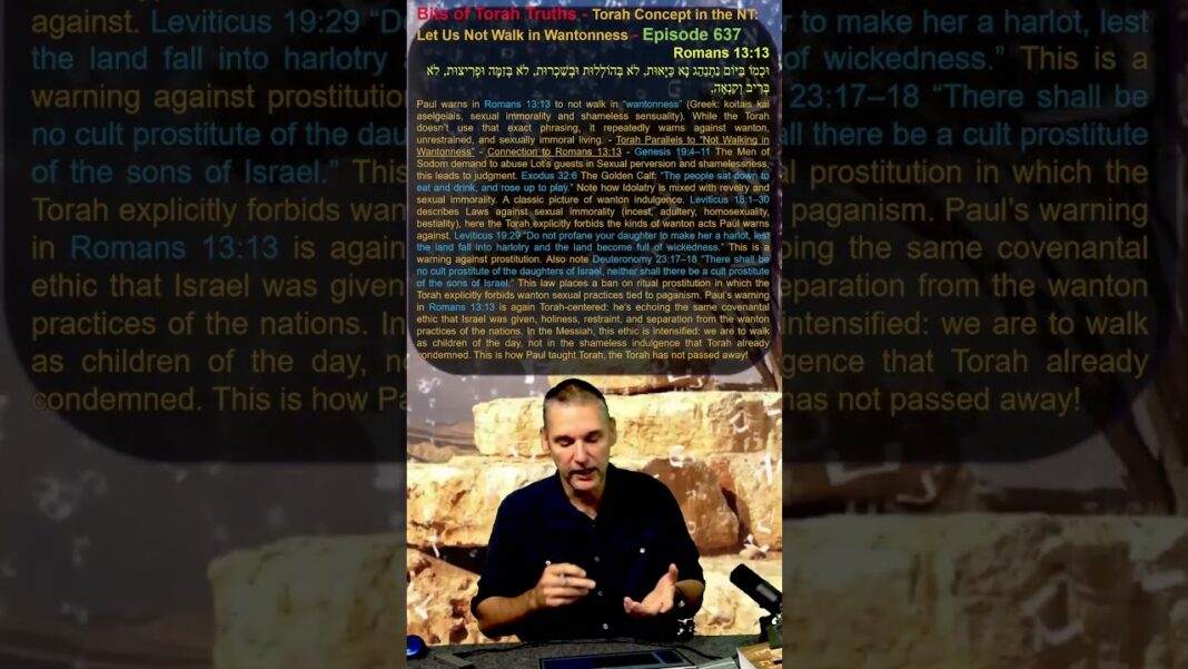 Paul warns in Romans 13:13 to not walk in “wantonness” (Greek: koitais kai aselgeiais, sexual immorality and shameless sensuality). While the Torah doesn’t use that exact phrasing, it repeatedly warns against wanton, unrestrained, and sexually immoral living. – Torah Parallels to “Not Walking in Wantonness” – Connection to Romans 13:13 – Genesis 19:4–11 The Men of Sodom demand to abuse Lot’s guests in Sexual perversion and shamelessness, this leads to judgment. Exodus 32:6 The Golden Calf: “The people sat down to eat and drink, and rose up to play.” Note how Idolatry is mixed with revelry and sexual immorality. A classic picture of wanton indulgence. Leviticus 18:1–30 describes Laws against sexual immorality (incest, adultery, homosexuality, bestiality), here the Torah explicitly forbids the kinds of wanton acts Paul warns against. Leviticus 19:29 “Do not profane your daughter to make her a harlot, lest the land fall into harlotry and the land become full of wickedness.” This is a warning against prostitution. Also note Deuteronomy 23:17–18 “There shall be no cult prostitute of the daughters of Israel, neither shall there be a cult prostitute of the sons of Israel.” This law places a ban on ritual prostitution in which the Torah explicitly forbids wanton sexual practices tied to paganism. Paul’s warning in Romans 13:13 is again Torah-centered: he’s echoing the same covenantal ethic that Israel was given, holiness, restraint, and separation from the wanton practices of the nations. In the Messiah, this ethic is intensified: we are to walk as children of the day, not in the shameless indulgence that Torah already condemned. This is how Paul taught Torah, the Torah has not passed away!
