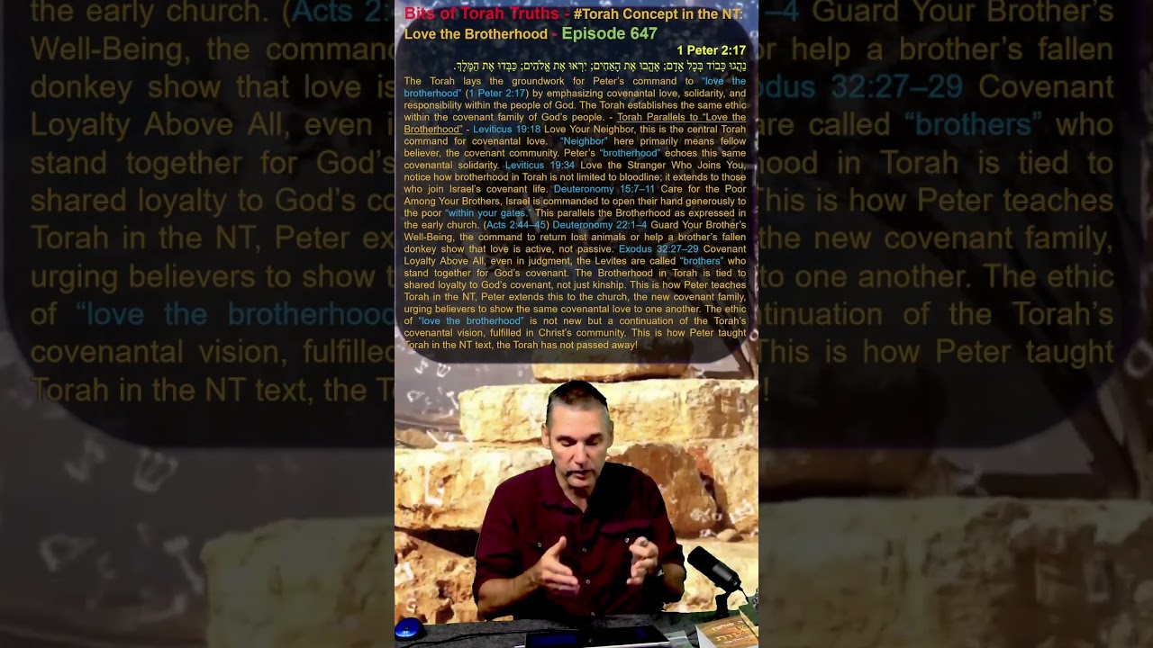 The Torah lays the groundwork for Peter’s command to “love the brotherhood” (1 Peter 2:17) by emphasizing covenantal love, solidarity, and responsibility within the people of God. The Torah establishes the same ethic within the covenant family of God’s people. – Torah Parallels to “Love the Brotherhood” – Leviticus 19:18 Love Your Neighbor, this is the central Torah command for covenantal love. “Neighbor” here primarily means fellow believer, the covenant community. Peter’s “brotherhood” echoes this same covenantal solidarity. Leviticus 19:34 Love the Stranger Who Joins You, notice how brotherhood in Torah is not limited to bloodline; it extends to those who join Israel’s covenant life. Deuteronomy 15:7–11 Care for the Poor Among Your Brothers, Israel is commanded to open their hand generously to the poor “within your gates.” This parallels the Brotherhood as expressed in the early church. (Acts 2:44–45) Deuteronomy 22:1–4 Guard Your Brother’s Well-Being, the command to return lost animals or help a brother’s fallen donkey show that love is active, not passive. Exodus 32:27–29 Covenant Loyalty Above All, even in judgment, the Levites are called “brothers” who stand together for God’s covenant. The Brotherhood in Torah is tied to shared loyalty to God’s covenant, not just kinship. This is how Peter teaches Torah in the NT, Peter extends this to the church, the new covenant family, urging believers to show the same covenantal love to one another. The ethic of “love the brotherhood” is not new but a continuation of the Torah’s covenantal vision, fulfilled in Christ’s community. This is how Peter taught Torah in the NT text, the Torah has not passed away!