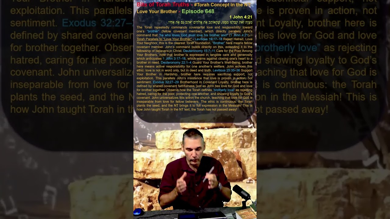 The Torah repeatedly commands covenantal love and responsibility toward one’s “brother” (fellow covenant member), which directly parallels John’s command that “he who loves God must love his brother also” (1 John 4:21). – Torah Parallels to “Love Your Brother” – Leviticus 19:17–18 Reject Hatred, Love Your Neighbor, this is the clearest Torah foundation. “Brother” here means fellow covenant member. John’s command builds directly on this, extending it to the fellowship of believers in Christ. Deuteronomy 15:7–11 Care for the Poor Among Your Brothers, note that brother is expressed in tangible care and generosity which anticipates 1 John 3:17–18, which warns against closing one’s heart to a brother in need. Deuteronomy 22:1–4 Guard Your Brother’s Well-Being, brother here means active responsibility for one another’s welfare. John echoes this ethic: love is not in word only, but in deed and truth. Leviticus 25:35–36 Support Your Brother in Hardship, brother here requires sacrificial support, not exploitation. This parallels John’s insistence that love is proven in action, not sentiment. Exodus 32:27–29 Brotherhood in Covenant Loyalty, brother here is defined by shared covenant faithfulness, just as John ties love for God and love for brother together. Observe how the Torah defines “brotherly love” as rejecting hatred, caring for the poor, protecting one another, and showing loyalty to God’s covenant. John universalizes this within the church, teaching that love for God is inseparable from love for fellow believers. The ethic is continuous: the Torah plants the seed, and the NT brings it to full expression in the Messiah! This is how John taught Torah in the NT text, the Torah has not passed away!