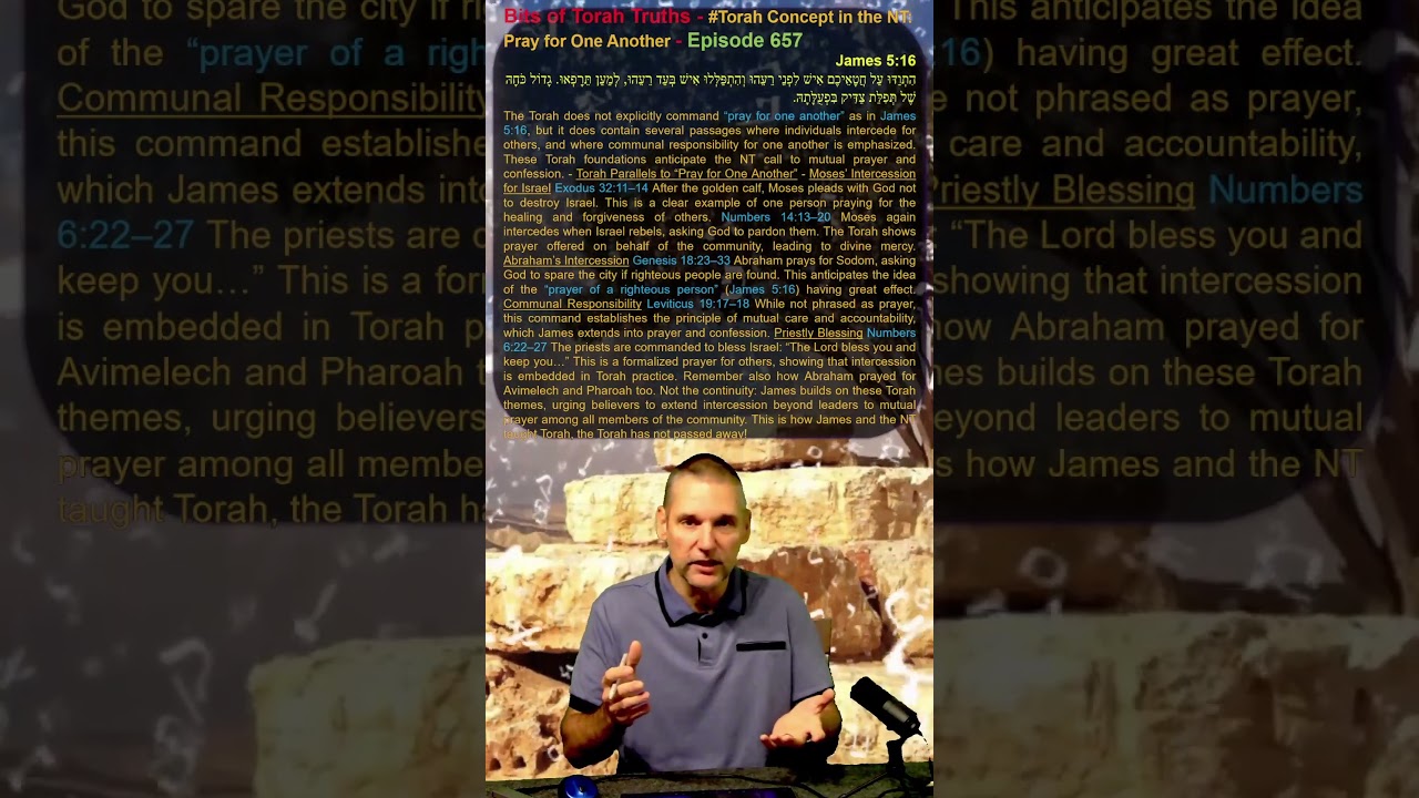The Torah does not explicitly command “pray for one another” as in James 5:16, but it does contain several passages where individuals intercede for others, and where communal responsibility for one another is emphasized. These Torah foundations anticipate the NT call to mutual prayer and confession. – Torah Parallels to “Pray for One Another” – Moses’ Intercession for Israel Exodus 32:11–14 After the golden calf, Moses pleads with God not to destroy Israel. This is a clear example of one person praying for the healing and forgiveness of others. Numbers 14:13–20 Moses again intercedes when Israel rebels, asking God to pardon them. The Torah shows prayer offered on behalf of the community, leading to divine mercy. Abraham’s Intercession Genesis 18:23–33 Abraham prays for Sodom, asking God to spare the city if righteous people are found. This anticipates the idea of the “prayer of a righteous person” (James 5:16) having great effect. Communal Responsibility Leviticus 19:17–18 While not phrased as prayer, this command establishes the principle of mutual care and accountability, which James extends into prayer and confession. Priestly Blessing Numbers 6:22–27 The priests are commanded to bless Israel: “The Lord bless you and keep you…” This is a formalized prayer for others, showing that intercession is embedded in Torah practice. Remember also how Abraham prayed for Avimelech and Pharoah too. Not the continuity: James builds on these Torah themes, urging believers to extend intercession beyond leaders to mutual prayer among all members of the community. This is how James and the NT taught Torah, the Torah has not passed away!