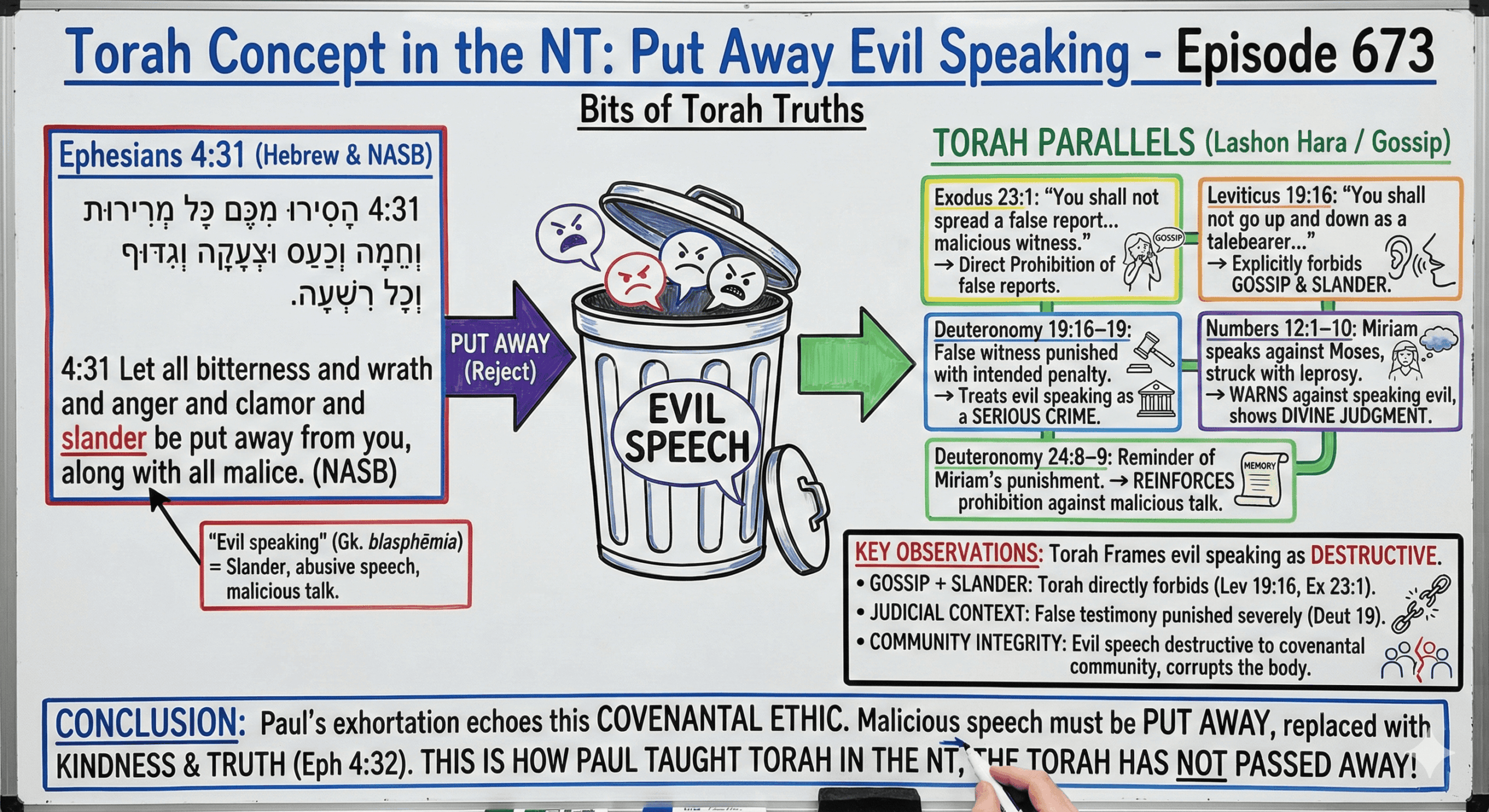 The Torah frames evil speaking as gossip, slander, and false witness which are destructive acts that undermine justice and community trust. Paul’s exhortation in Ephesians 4:31 echoes this covenantal ethic: malicious speech must be put away, replaced with kindness and truth (Eph. 4:32). This is how Paul taught Torah in the NT, the Torah has not passed away!