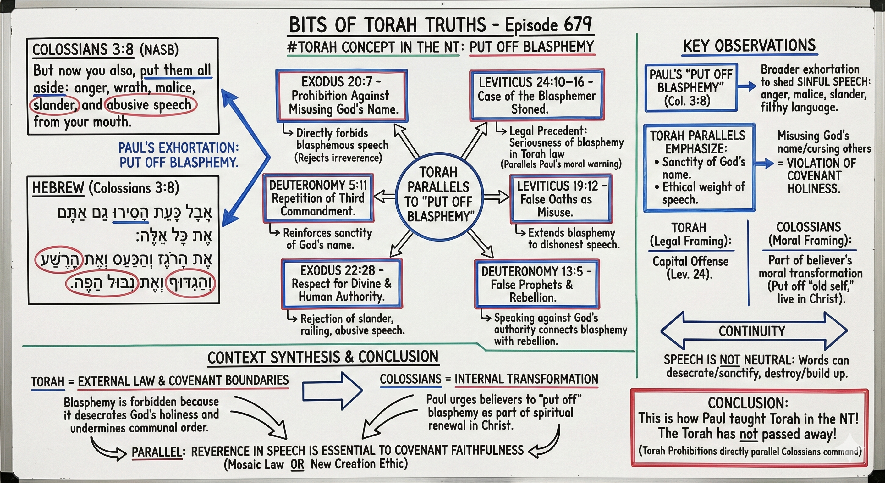 The Torah’s prohibitions against gossip, false oaths, cursing, and irreverent use of God’s name (Exodus 20:7; Leviticus 19:16; Exodus 22:28) are direct parallels to Colossians 3:8’s command to “put off filthy communication.” This is how Paul taught Torah in the NT, the Torah has not passed away!