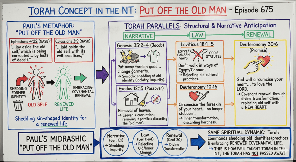 Paul’s phrase “put off the old man” (Eph. 4:22; Col. 3:9) is about shedding a former identity shaped by sin and embracing a renewed life. While the Torah doesn’t use that exact metaphor, it does contain structural and narrative parallels that anticipate the idea of leaving behind an old self and embracing covenantal renewal.