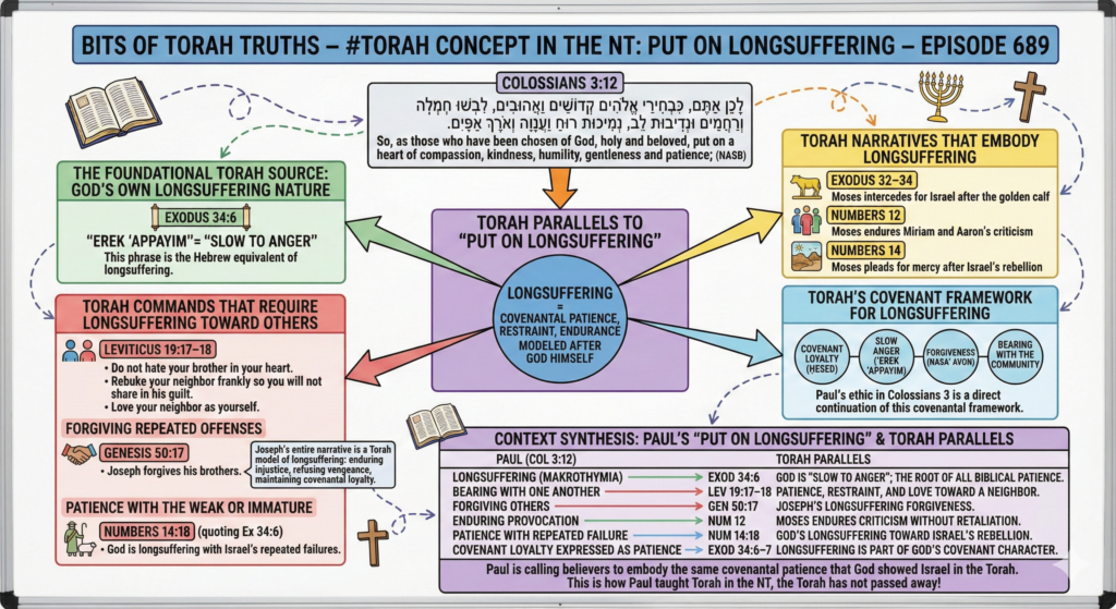 Longsuffering in the Torah is tied to: covenant loyalty (ḥesed), slow anger (’erek ’appayim), forgiveness (nasa’ avon), and bearing with the community. Paul’s ethic in Colossians 3 is a direct continuation of this covenantal framework.