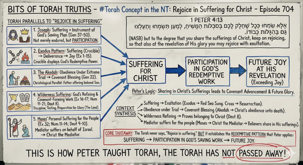 The Torah never says, “Rejoice in suffering.” But it establishes the redemptive pattern that Peter later applies: Suffering → Participation in God’s saving work → Future joy. Joseph, Moses, the Exodus, the Akedah, and the wilderness all form the theological architecture behind 1 Peter 4:13. This is how Peter taught Torah, the Torah has not passed away!