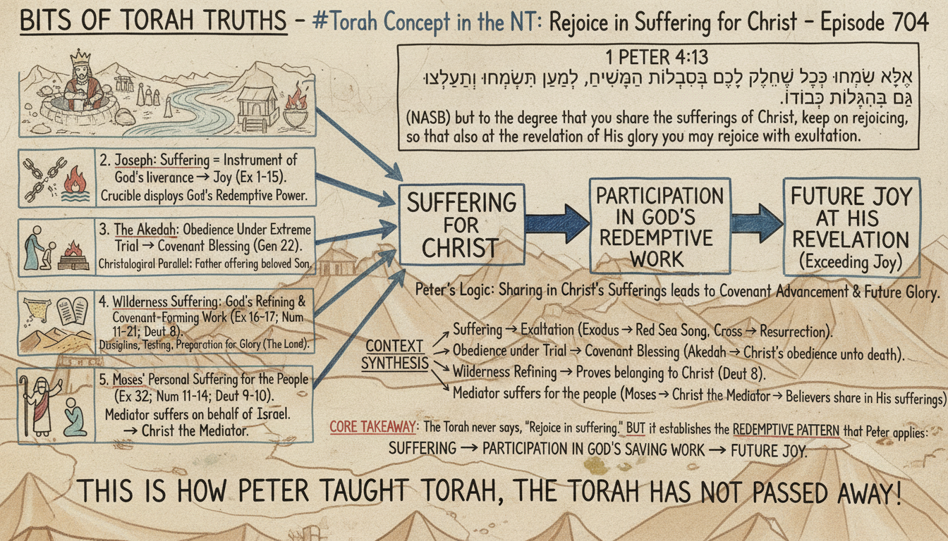 The Torah never says, “Rejoice in suffering.” But it establishes the redemptive pattern that Peter later applies: Suffering → Participation in God’s saving work → Future joy. Joseph, Moses, the Exodus, the Akedah, and the wilderness all form the theological architecture behind 1 Peter 4:13. This is how Peter taught Torah, the Torah has not passed away!