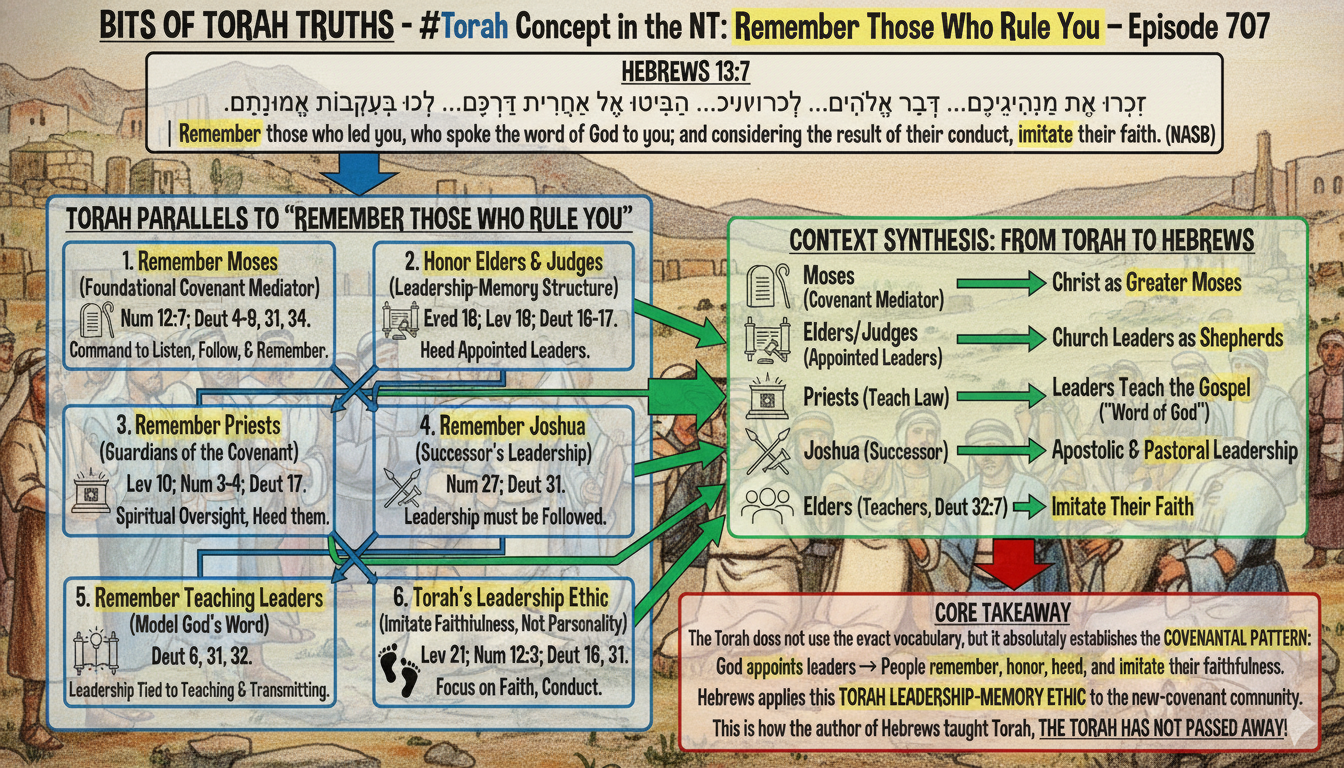 The Torah does not say “remember your leaders” in the exact language of Hebrews 13:7, but it absolutely establishes the covenantal pattern: God appoints leaders → the people remember, honor, heed, and imitate their faithfulness. Hebrews simply applies the Torah’s leadership‑memory ethic to the new‑covenant community. This is how the author of the book of Hebrews taught Torah, the Torah has not passed away!