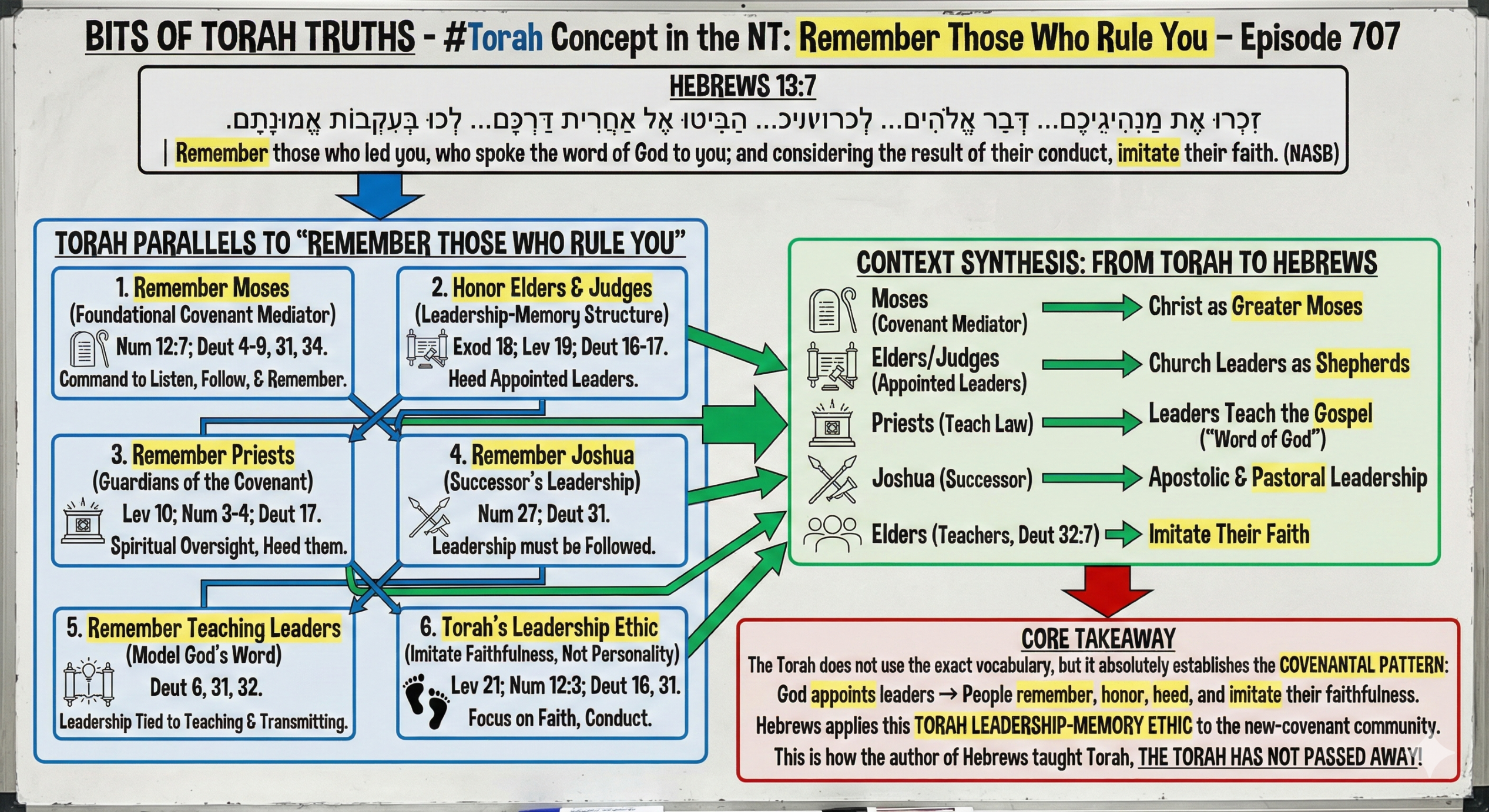 - “Teach your children” preserving truth across generations Deut. 6:6–9, 31:12–13; The Torah’s memory ethic is generational.