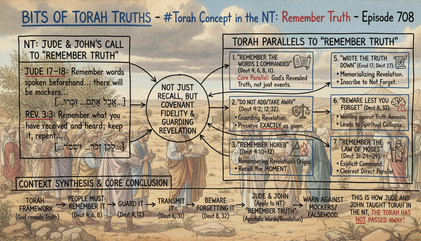 The Torah does not use the phrase “remember truth,” but it establishes the entire covenant framework behind Jude 17–18 and Revelation 3:3: God reveals truth → the people must remember it → guard it → transmit it → and beware forgetting it. This is how Jude and John taught Torah in the NT, the Torah has not passed away!