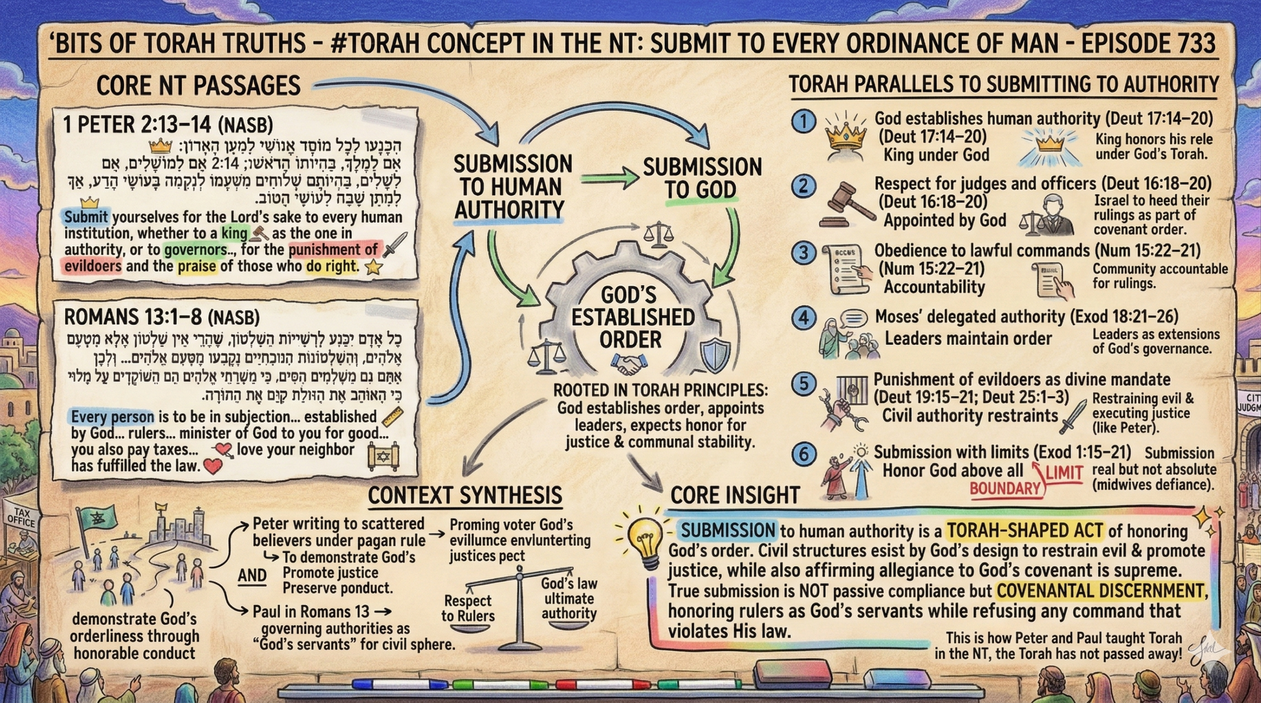 Peter writes to scattered believers living under pagan governments, urging them to demonstrate God’s orderliness through honorable conduct. His instruction mirrors the Torah’s covenantal logic: God establishes structures of authority to restrain evil, promote justice, and preserve societal peace. Paul in Romans 13 echoes the same pattern, governing authorities are “God’s servants” in the civil sphere, just as judges and kings were in Israel’s Torah framework. Both apostles assume the Torah’s balance: respect and obedience to rulers as part of honoring God, yet with the clear boundary that God’s law remains the ultimate authority when human commands contradict His will.