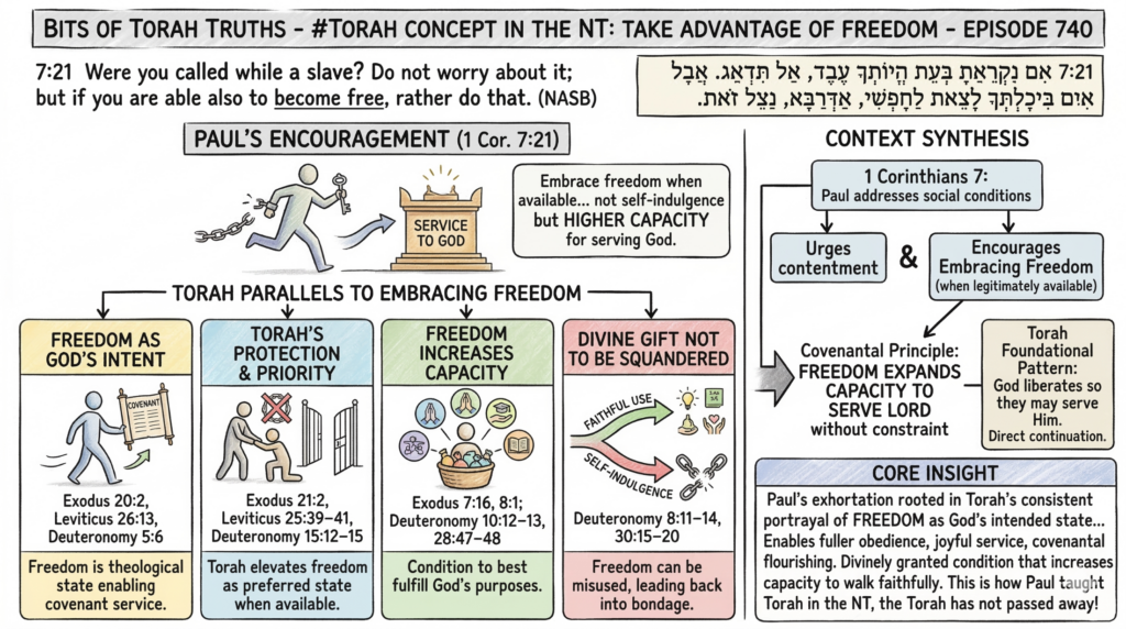Paul’s exhortation to “use” freedom when available is rooted in the Torah’s consistent portrayal of freedom as God’s intended state for His people, one that enables fuller obedience, joyful service, and covenantal flourishing. Freedom is not an end in itself but a divinely granted condition that increases one’s capacity to walk faithfully with God. This is how Paul taught Torah in the NT, the Torah has not passed away!