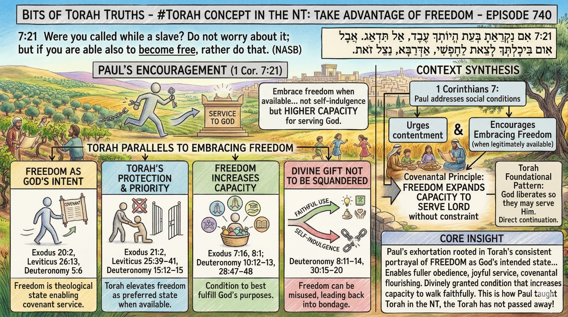 Paul encourages believers who have the opportunity for freedom to embrace it (1 Cor. 7:21), not as self‑indulgence but as a higher capacity for serving God. Torah contains the foundational logic for this principle: God liberates His people so they may serve Him freely and fully.