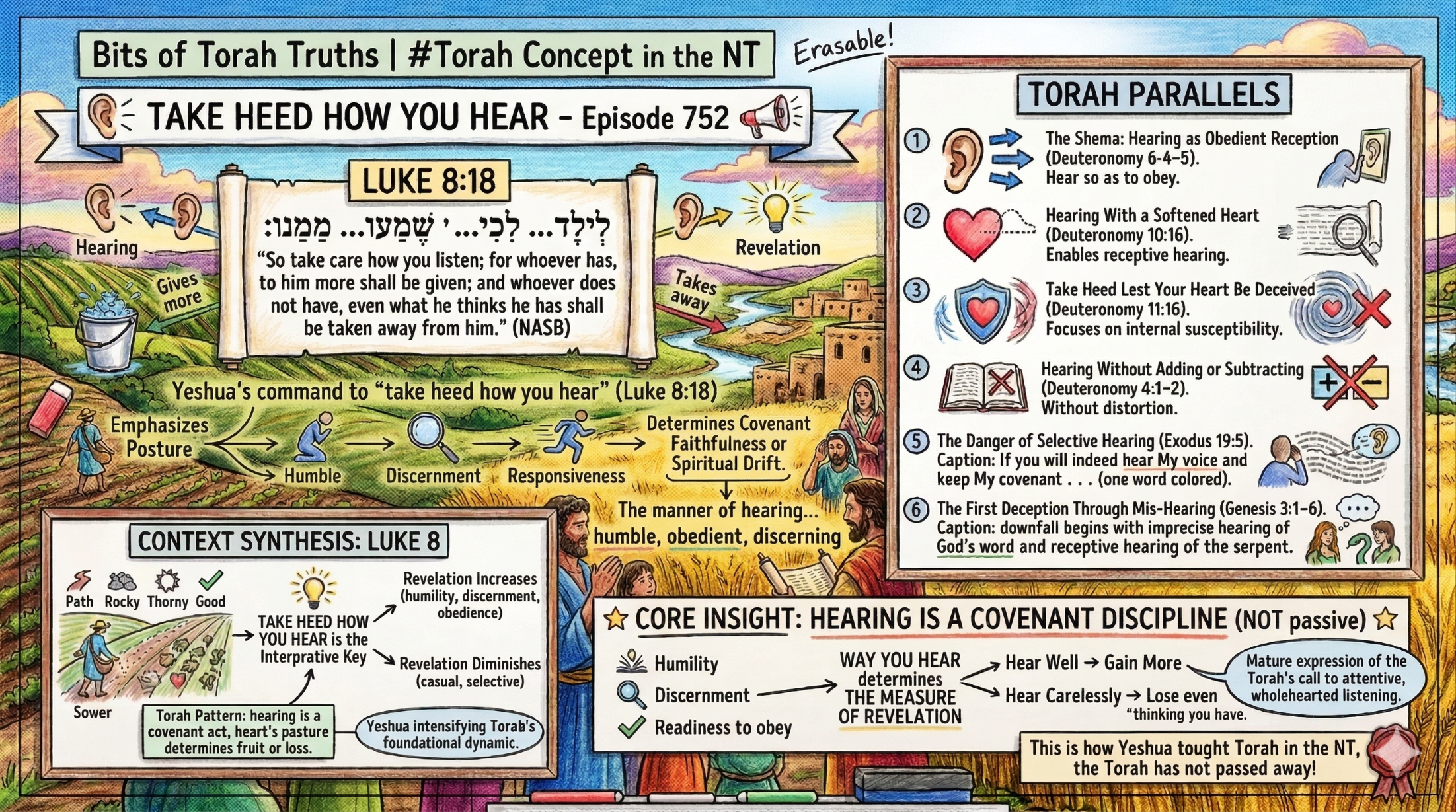 In Luke 8, Yeshua has just taught the parable of the Sower, where the central issue is not the seed but the soil the condition of the hearer. His command to “take heed how you hear” is the interpretive key: revelation increases for those who hear with humility, discernment, and obedience, but diminishes for those who hear casually or selectively. The Torah establishes this same pattern: hearing is a covenant act, and the heart’s posture determines whether God’s word bears fruit or is lost. Yeshua is not introducing a new principle but intensifying the Torah’s foundational hearing‑obedience dynamic.