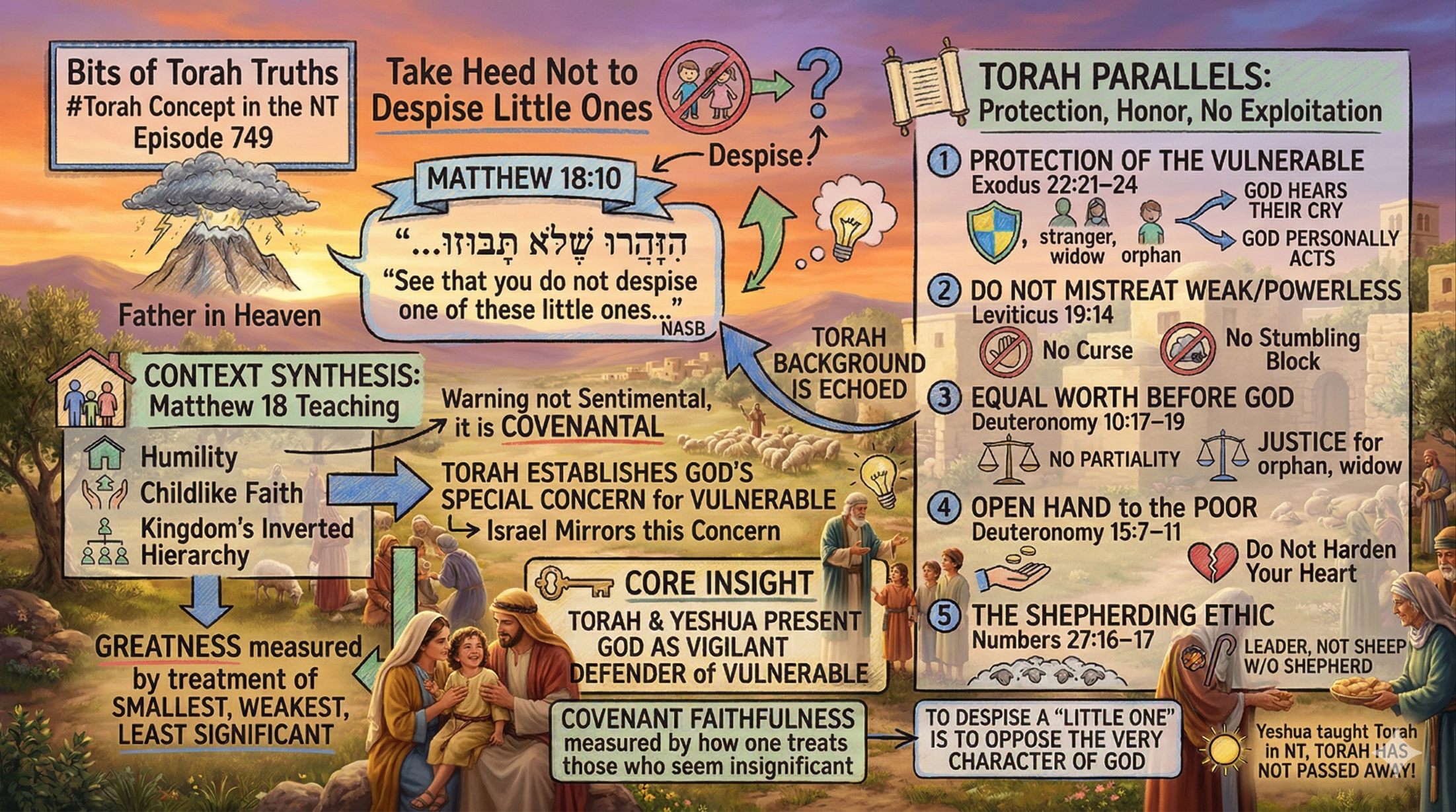 In Matthew 18, Yeshua is teaching about humility, childlike faith, and the kingdom’s inverted hierarchy. His warning not to despise “little ones” is not merely sentimental, it is covenantal. The Torah repeatedly establishes God’s special concern for the vulnerable and commands Israel to mirror that concern in community life. Yeshua’s teaching stands firmly within this trajectory: the greatness of the kingdom is measured by how one treats the smallest, weakest, and least socially significant.
