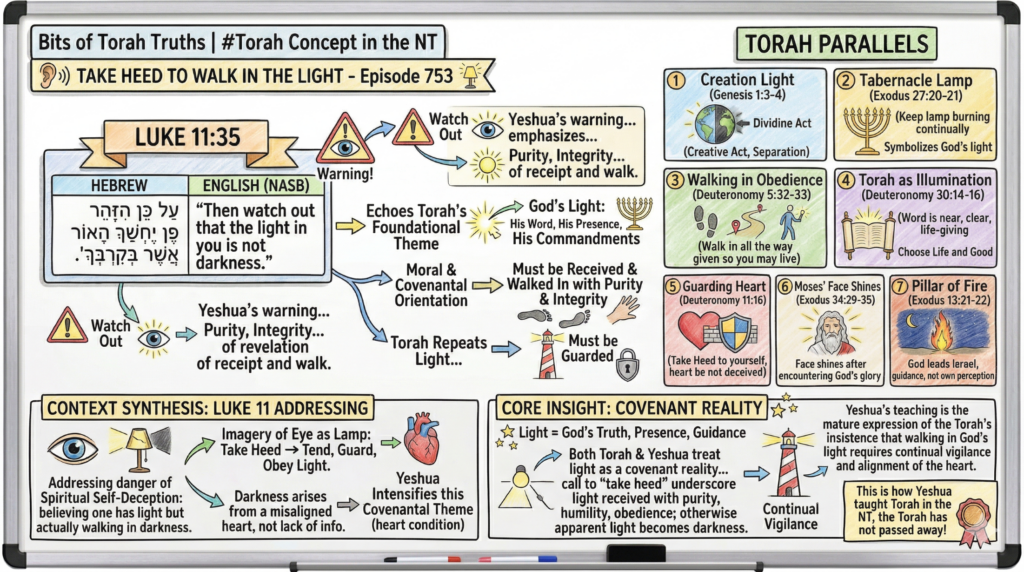 Both Torah and Yeshua treat light as a covenant reality, God’s truth, presence, and guidance made visible. The call to “take heed” underscores that light must be received with purity, humility, and obedience; otherwise, even what appears to be light becomes darkness. Yeshua’s teaching is the mature expression of the Torah’s insistence that walking in God’s light requires continual vigilance and alignment of the heart. This is how Yeshua taught Torah in the NT, the Torah has not passed away!