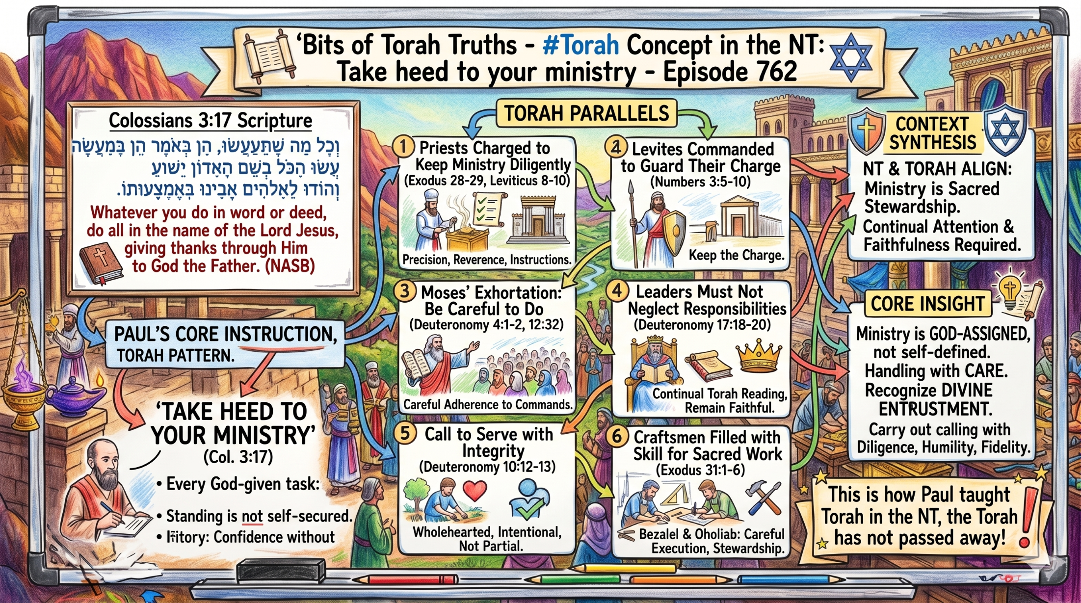 Colossians 3:17 teaches that every action done “in word or deed” must be carried out in the name of the Lord, implying intentionality, diligence, and accountability. The Torah establishes the same pattern: those entrusted with any form of service—priestly, royal, judicial, or communal—must guard their ministry, follow God’s instructions carefully, and carry out their responsibilities with integrity. Both Paul and the Torah present ministry as a sacred stewardship requiring continual attention and faithfulness.