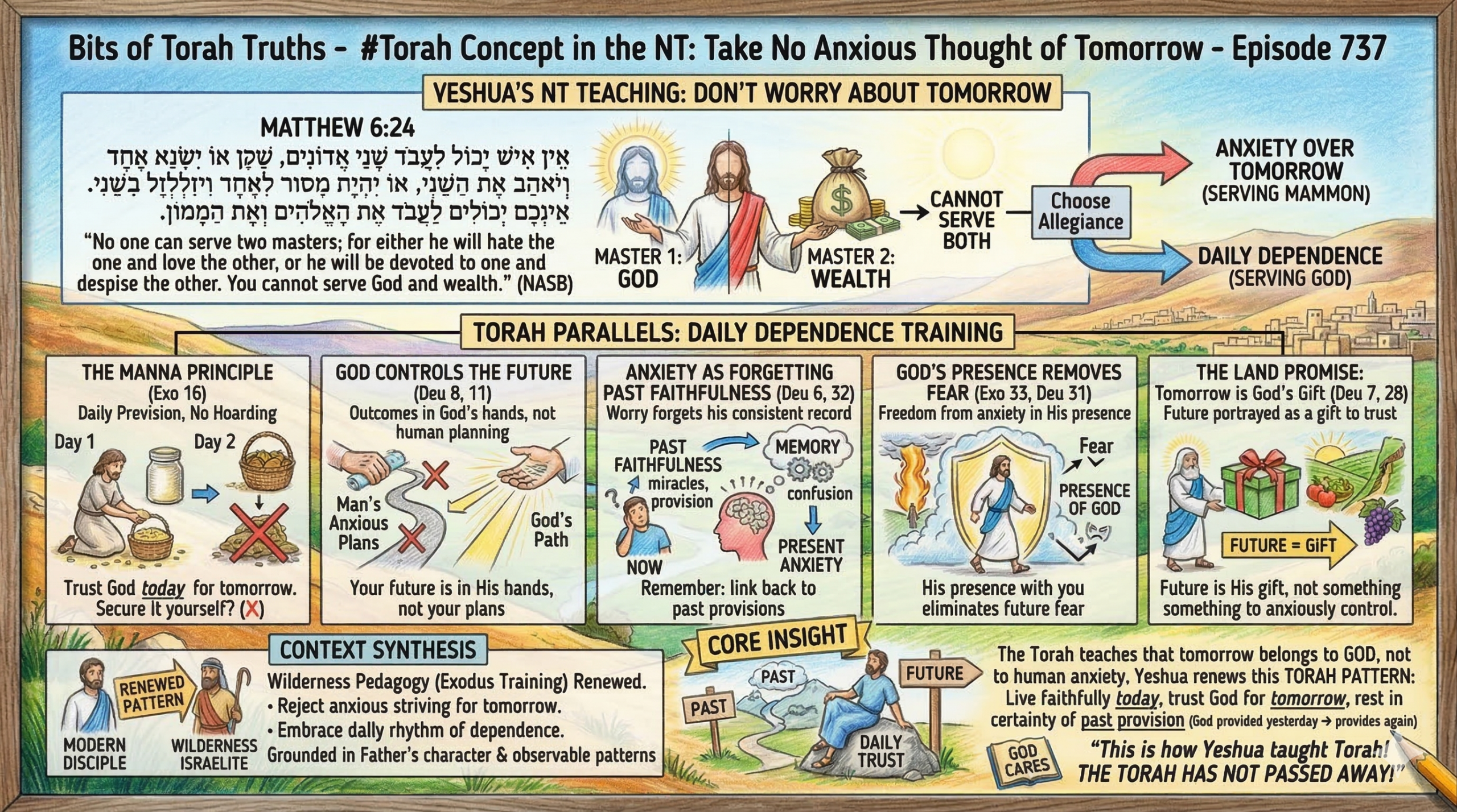 Yeshua’s instruction not to worry about tomorrow (Matthew 6:24) echoes the Torah’s foundational training in daily dependence on God rather than future‑oriented anxiety. The Torah repeatedly teaches Israel that God controls tomorrow, and His people are to trust Him one day at a time.