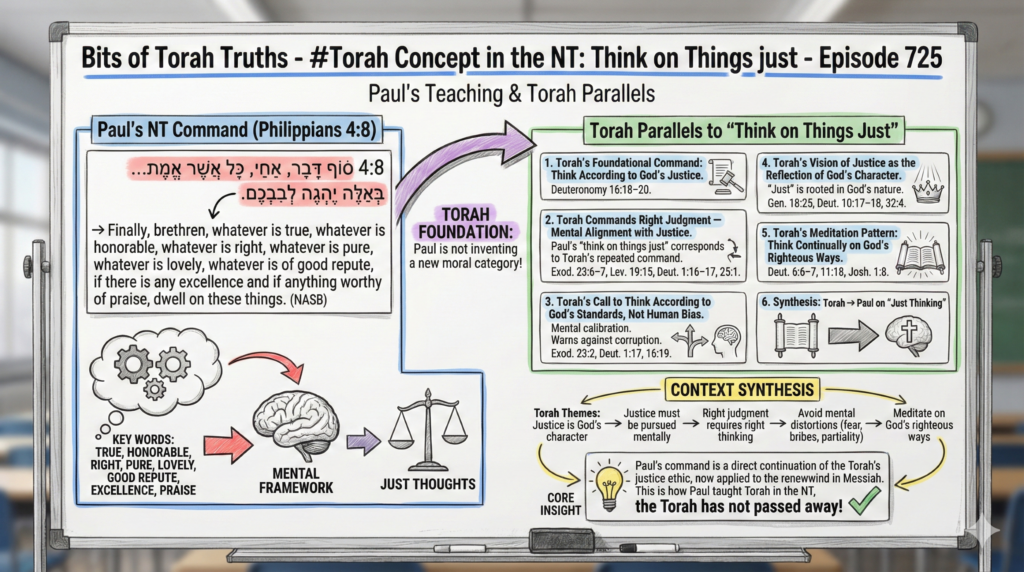 - Torah Commands Right Judgment, Mental Alignment with Justice. Paul’s “think on things just” corresponds to the Torah’s repeated command to judge rightly, which begins in the mind. Exod. 23:6–7, Lev. 19:15, Deut. 1:16–17, 25:1.