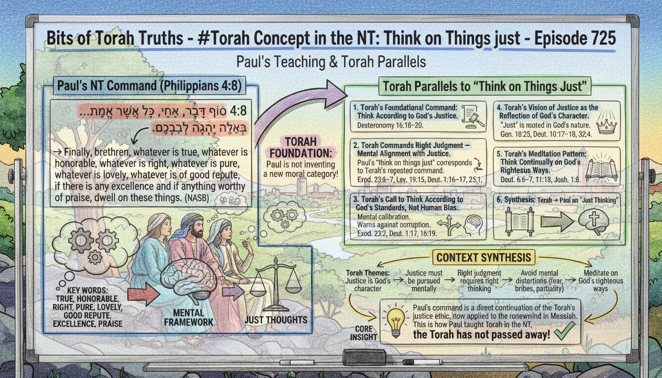 - Torah Commands Right Judgment, Mental Alignment with Justice. Paul’s “think on things just” corresponds to the Torah’s repeated command to judge rightly, which begins in the mind. Exod. 23:6–7, Lev. 19:15, Deut. 1:16–17, 25:1.