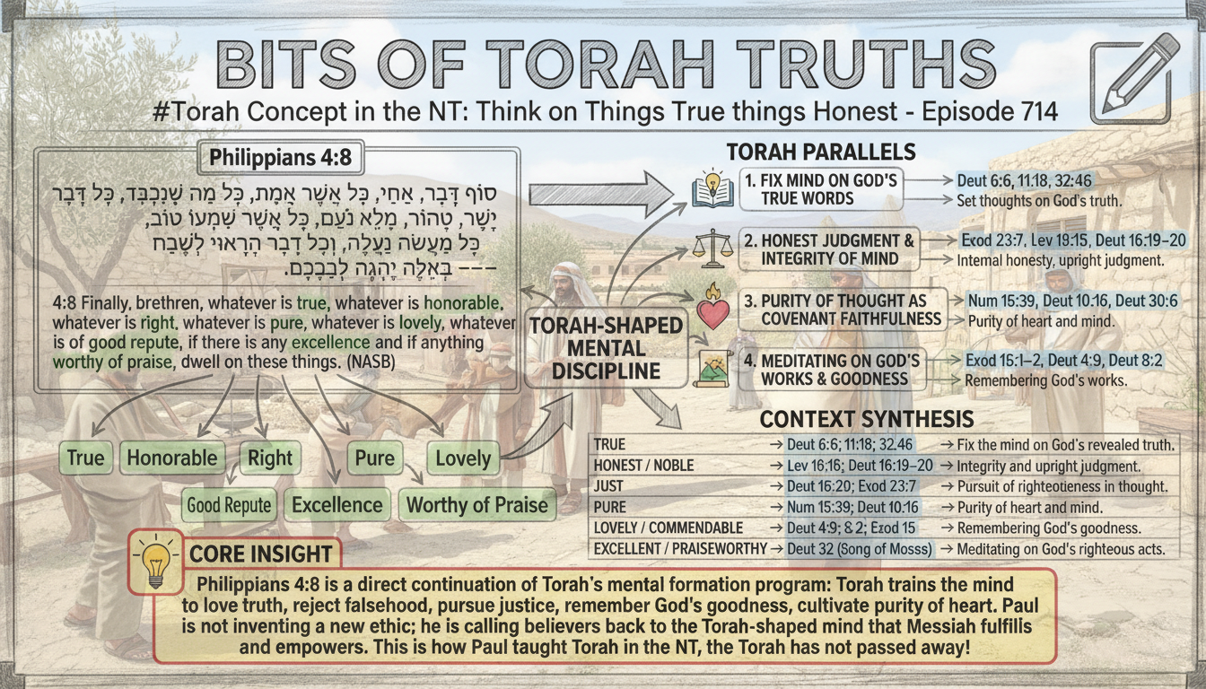 Philippians 4:8 is a direct continuation of Torah’s mental formation program: Torah trains the mind to love truth, Torah trains the mind to reject falsehood, Torah trains the mind to pursue justice, Torah trains the mind to remember God’s goodness, Torah trains the mind to cultivate purity of heart. Paul is not inventing a new ethic; he is calling believers back to the Torah-shaped mind that Messiah fulfills and empowers. This is how Paul taught Torah in the NT, the Torah has not passed away!