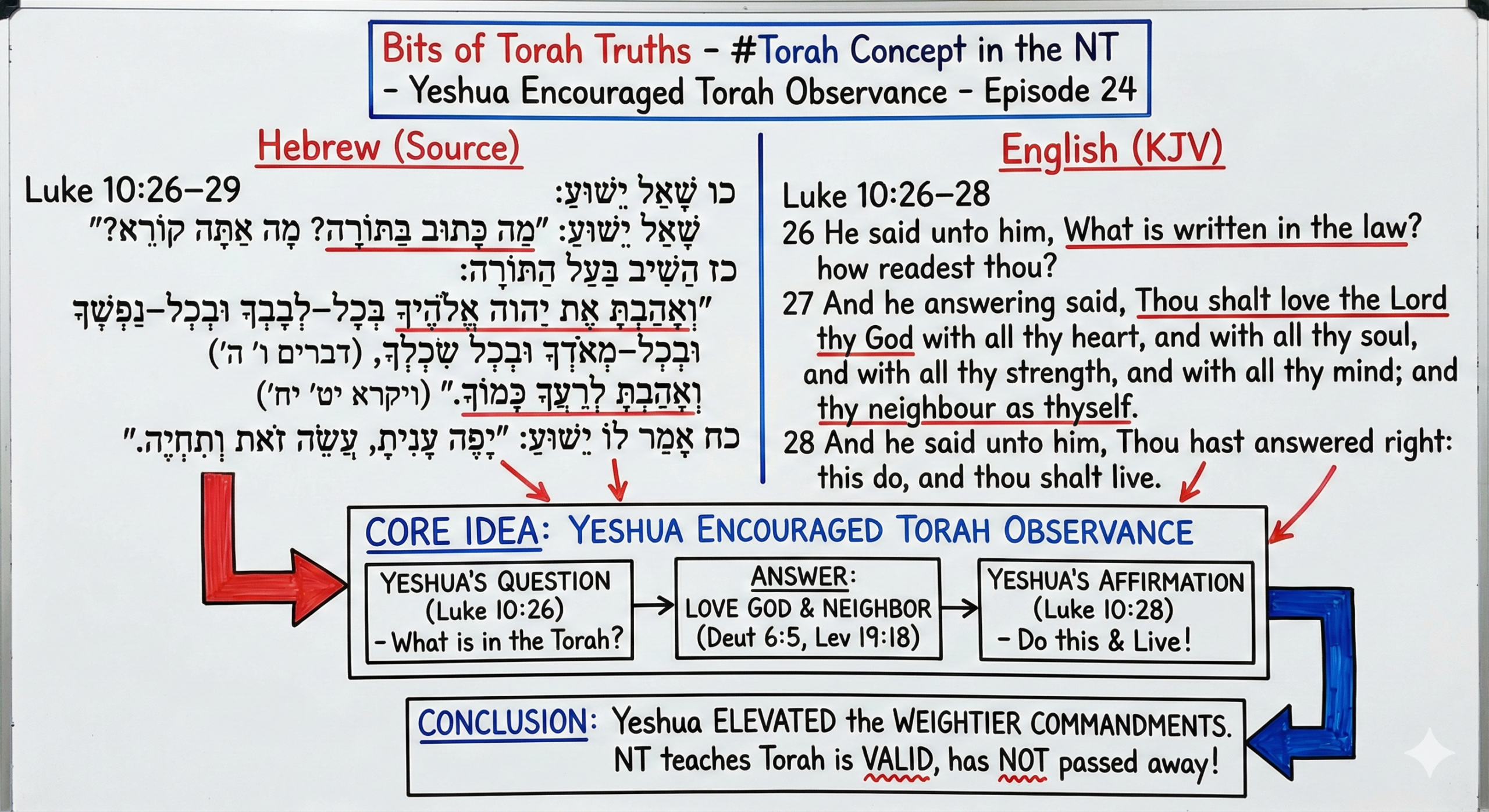 כו שָׁאַל יֵשׁוּעַ׃ ״מַה כָּתוּב בַּתּוֹרָה? מָה אַתָּה קוֹרֵא?״ כז הֵשִׁיב בַּעַל הַתּוֹרָה׃ ״וְאָהַבְתָּ אֶת יהוה אֱלֹהֶיךָ בְּכָל–לְבָבְךָ וּבְכָל–נַפְשְׁךָ וּבְכָל–מְאֹדְךָ וּבְכָל שִׂכְלְךָ, (דברים ו׳ ה׳) וְאָהַבְתָּ לְרֵעֲךָ כָּמוֹךָ.״ (ויקרא יט׳ יח׳) כח אָמַר לוֹ יֵשׁוּעַ׃ ״יָפֶה עָנִיתָ, עֲשֵׂה זֹאת וְתִחְיֶה.״