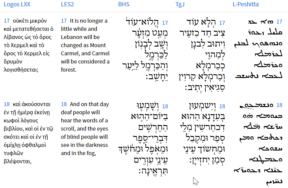 Isaiah writes וְשָׁמְעוּ בַיּוֹם-הַהוּא הַחֵרְשִׁים דִּבְרֵי-סֵפֶר וּמֵאֹפֶל וּמֵחֹשֶׁךְ עֵינֵי עִוְרִים תִּרְאֶינָה “And in that day shall the deaf hear the words of the book, And the eyes of the blind shall see out of obscurity, and out of darkness.” These things mean that the helpless will be empowered, those who lived by injustice will disappear, and the blind will see, and the deaf will hear the words of the scroll, the word of the Living God. We note again how the Lord God Almighty is on the side of the weak, the helpless, those who need help, because these are they who trust in Him. This echoes the idea that Yeshua taught in Matthew 5:5, blessed are the meek, for they shall inherit the earth. These things reveal to us how the proud, the arrogant, the leaders of this world will perish, and the common people will prevail, those who trust in the Lord will live! This is a general biblical truth, expressing what the Lord God will do for those who trust in Him. A text comparison reveals the following when comparing the LXX, MSS, and Targum translations.