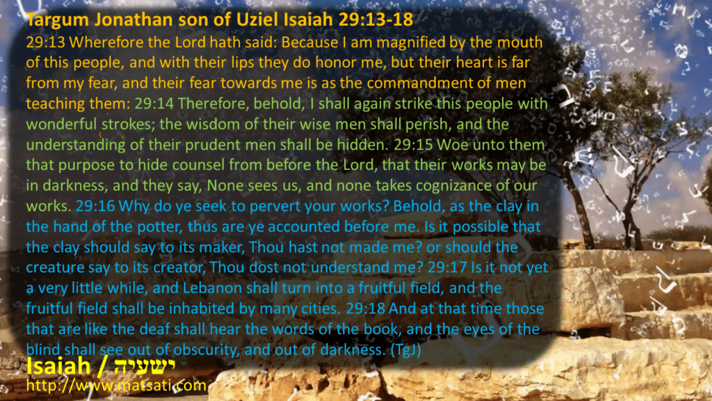 Targum Jonathan son of Uziel Isaiah 29:13-18 29:13 Wherefore the Lord hath said: Because I am magnified by the mouth of this people, and with their lips they do honor me, but their heart is far from my fear, and their fear towards me is as the commandment of men teaching them: 29:14 Therefore, behold, I shall again strike this people with wonderful strokes; the wisdom of their wise men shall perish, and the understanding of their prudent men shall be hidden. 29:15 Woe unto them that purpose to hide counsel from before the Lord, that their works may be in darkness, and they say, None sees us, and none takes cognizance of our works. 29:16 Why do ye seek to pervert your works? Behold, as the clay in the hand of the potter, thus are ye accounted before me. Is it possible that the clay should say to its maker, Thou hast not made me? or should the creature say to its creator, Thou dost not understand me? 29:17 Is it not yet a very little while, and Lebanon shall turn into a fruitful field, and the fruitful field shall be inhabited by many cities. 29:18 And at that time those that are like the deaf shall hear the words of the book, and the eyes of the blind shall see out of obscurity, and out of darkness. (TgJ)