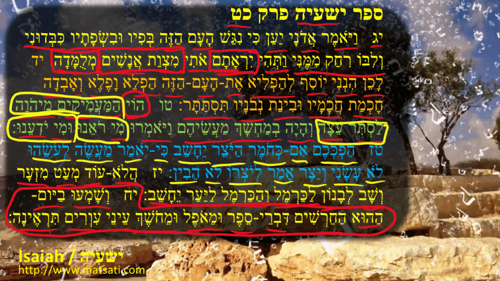 The TgJ translates close to the MSS stating, “17 Is it not yet a very little while, and Lebanon shall turn into a fruitful field, and the fruitful field shall be inhabited by many cities. 18 And at that time those that are like the deaf shall hear the words of the book, and the eyes of the blind shall see out of obscurity, and out of darkness.” It is obvious that the trees of Lebanon are an analogy for the people of Israel by the language that many cities will be inhabited in them. The LXX writes saying, 17 οὐκέτι μικρὸν καὶ μετατεθήσεται ὁ Λίβανος ὡς τὸ ὄρος τὸ Χερμελ καὶ τὸ ὄρος τὸ Χερμελ εἰς δρυμὸν λογισθήσεται; 18 καὶ ἀκούσονται ἐν τῇ ἡμέρᾳ ἐκείνῃ κωφοὶ λόγους βιβλίου, καὶ οἱ ἐν τῷ σκότει καὶ οἱ ἐν τῇ ὁμίχλῃ ὀφθαλμοὶ τυφλῶν βλέψονται, 17It is no longer a little while and Lebanon will be changed as Mount Carmel, and Carmel will be considered a forest.18And on that day deaf people will hear the words of a scroll, and the eyes of blind people will see in the darkness and in the fog (LES) It is interesting how Mount Carmel is mentioned in Isaiah 29:17 in the LXX. There is much imagery that is drawn in by this, such as idolatry in Baal worship, and Elijah, how the prophets of God were persecuted and needed to be hidden so as not to be killed by Baal worshipers, etc. We note again how these words of Isaiah speak to the faithfulness of God who is there for the downtrodden members of society, all of those who hold strong to their faith in the God of Israel. The Lord God promises here that there will be a day for when the blind will see, and the deaf will hear. We note how there is something very powerful here in Isaiah’s words concerning the future expectation of what God is going to do, specifically in His promised Messiah! We note that in all of the Tanakh, there is no mention of anyone receiving sight (making the blind see). This idea of receiving sight to see was completely a prerogative of God (see Shemot / Exodus 4:11, Tehillim / Psalms 146:8) The point is when we read the NT text, we see something that only the Messiah of God can do in regards to make the blind see and the deaf to hear. In Luke 4:18, Yeshua gave sight to the blind we are told, because the Spirit of God was upon him! Isaiah says this is something the Messiah of God would do (Isaiah 29:18, 35:5, 42:7). This example provides us with a clear claim to Yeshua being the long-awaited Messiah of God that Israel and the world has been waiting for! This miracle of healing the blind and the deaf is a clear demonstration that Yeshua was the anointed Messiah of the God of Israel! We note that there was no disciple that were involved in giving sight to the blind, outside of Ananias and his involvement in praying for Paul so he could see, and it says that something like scales fell from his eyes after Ananias had prayed. This is the point here, of the promised hope that Isaiah is providing here, and is exactly what we have today in Yeshua the Messiah, a promise of hope, or peace, of life, and of power in the spirit to live for the Lord and bring glory to His Holy Name! We are able to truly see, to truly hear, to read and listen hearing the words of the scroll of life, the word of the Living God for those who place their faith in Yeshua the Messiah!
