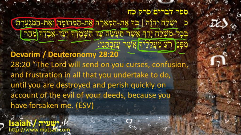 Devarim / Deuteronomy 28:20 28:20 “The Lord will send on you curses, confusion, and frustration in all that you undertake to do, until you are destroyed and perish quickly on account of the evil of your deeds, because you have forsaken me. (ESV)