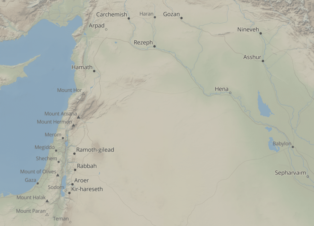 Isaiah 37:10 states, “Thus shall ye speak to Hezekiah king of Judah, saying, Let not thy God, in whom thou trustest, deceive thee, saying, Jerusalem shall not be given into the hand of the king of Assyria. (כֹּה תֹאמְרוּן אֶל-חִזְקִיָּהוּ מֶלֶךְ-יְהוּדָה לֵאמֹר אַל-יַשִּׁאֲךָ אֱלֹהֶיךָ אֲשֶׁר אַתָּה בּוֹטֵחַ בּוֹ לֵאמֹר לֹא תִנָּתֵן יְרוּשָׁלַם בְּיַד מֶלֶךְ אַשּׁוּר)” Isaiah 37:11 “Behold, thou hast heard what the kings of Assyria have done to all lands by destroying them utterly; and shalt thou be delivered? (הִנֵּה | אַתָּה שָׁמַעְתָּ אֲשֶׁר עָשֹוּ מַלְכֵי אַשּׁוּר לְכָל-הָאֲרָצוֹת לְהַחֲרִימָם וְאַתָּה תִּנָּצֵל)” Isaiah 37:12 “Have the gods of the nations delivered them which my fathers have destroyed, as Gozan, and Haran, and Rezeph, and the children of Eden which were in Telassar? (הַהִצִּילוּ אוֹתָם אֱלֹהֵי הַגּוֹיִם אֲשֶׁר הִשְׁחִיתוּ אֲבוֹתַי אֶת-גּוֹזָן וְאֶת-חָרָן וְרֶצֶף וּבְנֵי-עֶדֶן אֲשֶׁר בִּתְלַשָּׂר)” So the again here Rabshakeh is questioning the power of God to deliver Judah, and the evil one is asking the people to stop trusting in the Lord God of Israel saying that the nation of Assyria is more powerful. Rabshakeh then illustrates his point saying that Assyria has destroyed other nations, even the nations of the children of paradise (Eden). The children of Eden are described as Gozan, Haran, and Rezeph.