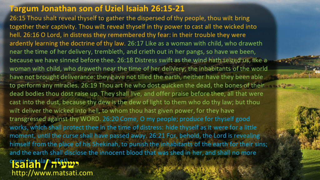 26:15 Thou shalt reveal thyself to gather the dispersed of thy people, thou wilt bring together their captivity. Thou wilt reveal thyself in thy power to cast all the wicked into hell. 26:16 O Lord, in distress they remembered thy fear: in their trouble they were ardently learning the doctrine of thy law. 26:17 Like as a woman with child, who draweth near the time of her delivery, trembleth, and crieth out in her pangs, so have we been, because we have sinned before thee. 26:18 Distress swift as the wind hath seized us, like a woman with child, who draweth near the time of her delivery; the inhabitants of the world have not brought deliverance: they have not tilled the earth, neither have they been able to perform any miracles. 26:19 Thou art he who dost quicken the dead, the bones of their dead bodies thou dost raise up. They shall live, and offer praise before thee, all that were cast into the dust, because thy dew is the dew of light to them who do thy law; but thou wilt deliver the wicked into hell, to whom thou hast given power, for they have transgressed against thy WORD. 26:20 Come, O my people; produce for thyself good works, which shall protect thee in the time of distress: hide thyself as it were for a little moment, until the curse shall have passed away. 26:21 For, behold, the Lord is revealing himself from the place of his Shekinah, to punish the inhabitants of the earth for their sins; and the earth shall disclose the innocent blood that was shed in her, and shall no more cover her slain. (TgJ)