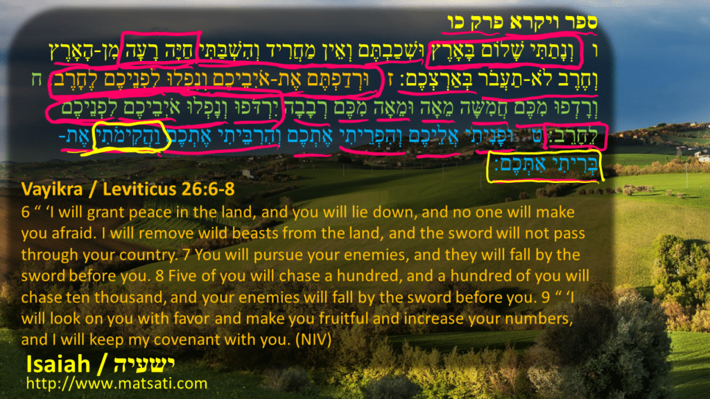 ו וְנָתַתִּי שָׁלוֹם בָּאָרֶץ וּשְׁכַבְתֶּם וְאֵין מַחֲרִיד וְהִשְׁבַּתִּי חַיָּה רָעָה מִן-הָאָרֶץ וְחֶרֶב לֹא-תַעֲבֹר בְּאַרְצְכֶם: ז וּרְדַפְתֶּם אֶת-אֹיְבֵיכֶם וְנָפְלוּ לִפְנֵיכֶם לֶחָרֶב: ח וְרָדְפוּ מִכֶּם חֲמִשָּׁה מֵאָה וּמֵאָה מִכֶּם רְבָבָה יִרְדֹּפוּ וְנָפְלוּ אֹיְבֵיכֶם לִפְנֵיכֶם לֶחָרֶב: ט וּפָנִיתִי אֲלֵיכֶם וְהִפְרֵיתִי אֶתְכֶם וְהִרְבֵּיתִי אֶתְכֶם וַהֲקִימֹתִי אֶת-בְּרִיתִי אִתְּכֶם: