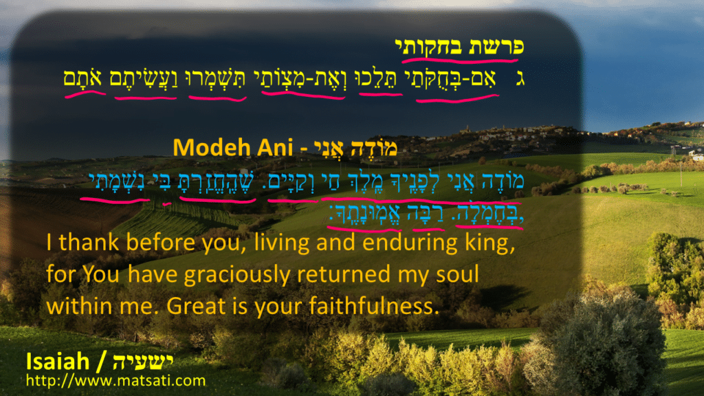 מוֹדֶה אֲנִי לְפָנֶֽיךָ מֶֽלֶךְ חַי וְקַיָּים. שֶׁהֶֽחֱזַֽרְתָּ בִּי נִשְׁמָתִי ,בְּחֶמְלָה. רַבָּה אֱמֽוּנָתֶֽךָ׃