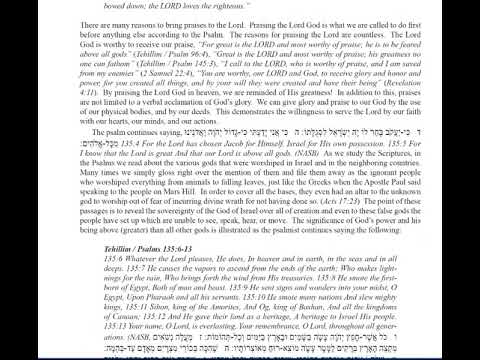 In this week’s study from Tehillim / Psalms 135:1-21, the psalm opens saying, א הַלְלוּיָהּ | הַלְלוּ אֶת-שֵׁם יְהֹוָה הַלְלוּ עַבְדֵי יְהֹוָה: ב שֶׁעֹמְדִים בְּבֵית יְהֹוָה בְּחַצְרוֹת בֵּית אֱלֹהֵינוּ: ג הַלְלוּיָהּ כִּי-טוֹב יְהֹוָה זַמְּרוּ לִשְׁמוֹ כִּי נָעִים: 135:1 Praise the Lord! Praise the name of the Lord; Praise Him, O servants of the Lord, 135:2 You who stand in the house of the Lord, In the courts of the house of our God! 135:3 Praise the Lord, for the Lord is good; Sing praises to His name, for it is lovely. (NASB) The psalmist speaks of the importance of praising the Lord for who he is, Creator, Master, Lord, and the One who loves us beyond words can describe. This is why He showed us the greatness of His love instead. The psalm continues saying, ד כִּי-יַעֲקֹב בָּחַר לוֹ יָהּ יִשְֹרָאֵל לִסְגֻלָּתוֹ: ה כִּי אֲנִי יָדַעְתִּי כִּי-גָדוֹל יְהֹוָה וַאֲדֹנֵינוּ מִכָּל-אֱלֹהִים: 135:4 For the Lord has chosen Jacob for Himself, Israel for His own possession. 135:5 For I know that the Lord is great And that our Lord is above all gods. (NASB) He goes on to speak of how the Lord is the Creator and does as he pleases (135:6), He is in control of natural processes (135:7), He killed the first born of Egypt (135:8), He struck nations (135:10-11), and He gave as an inheritance the land of Israel (135:12). As a result of these things, we speak of the mighty works of the Lord to our children, and therefore remembrance of His great deeds are remembered through all generations (135:13). Read more here: Tehillim 135-Part1