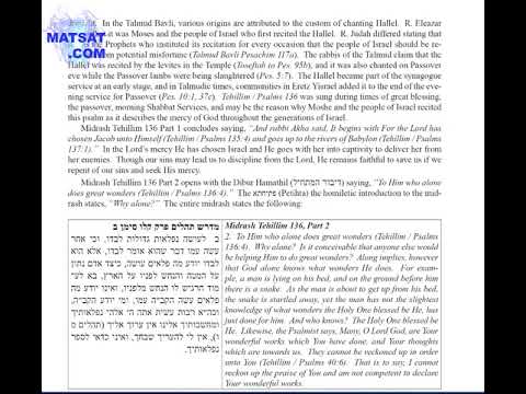 Midrash Tehillim 136, Part 1 1. O give thanks unto the Lord, for He is good, for His mercy endures forever (Tehillim / Psalms 136:1). Rabbi Joshua son of Levi taught, Give thanks unto the Lord who makes a man pay for his sins out of his property, a rich man pays with his ox; a poor man, with his lamb; and orphan, with his egg; and a widow, with her hen. Rabbi Joshua son of Levi said further, With reference to whom is His mercy endured forever repeated twenty six times in this Psalm? With reference to the twenty six generations which God created in His world, generations to which He did not give the Torah, but which in His mercy He sustained. Why is this Psalm called the Great Hallel? Rabbi Johanan explained, Because this Psalm says that the Holy One blessed be He, sits in the highest heaven of the universe and apportions food to every creature. Where does the Great Hallel begin? Rabbbi Judah said, it begins with O give thanks unto the Lord (Tehillim / Psalms 136:1) and goes up to By the rivers of Babylon (Tehillim / Psalms 137:1). But rabbi Johanan maintained, It begins with A song of Ascents and goes up to By the rivers of Babylon (Tehillim / Psalms 137:1). And rabbi Akha said, It begins with For the Lord has chosen Jacob unto Himself (Tehillim / Psalms 135:4) and goes up to the rivers of Babylon (Tehillim / Psalms 137:1). |