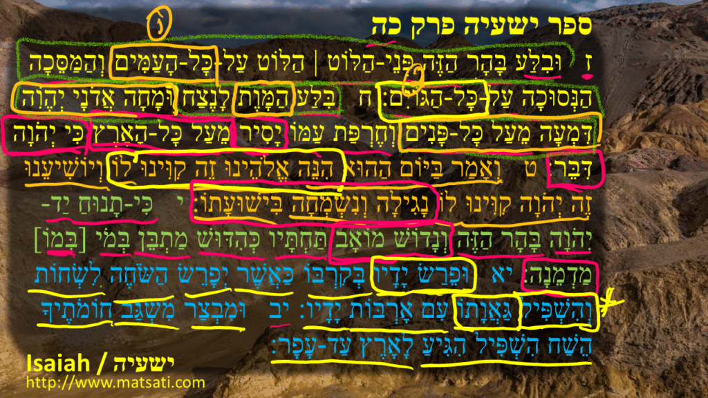 ז וּבִלַּע בָּהָר הַזֶּה פְּנֵי-הַלּוֹט | הַלּוֹט עַל-כָּל-הָעַמִּים וְהַמַּסֵּכָה הַנְּסוּכָה עַל-כָּל-הַגּוֹיִם: ח בִּלַּע הַמָּוֶת לָנֶצַח וּמָחָה אֲדֹנָי יְהֶוִֹה דִּמְעָה מֵעַל כָּל-פָּנִים וְחֶרְפַּת עַמּוֹ יָסִיר מֵעַל כָּל-הָאָרֶץ כִּי יְהֹוָה דִּבֵּר: