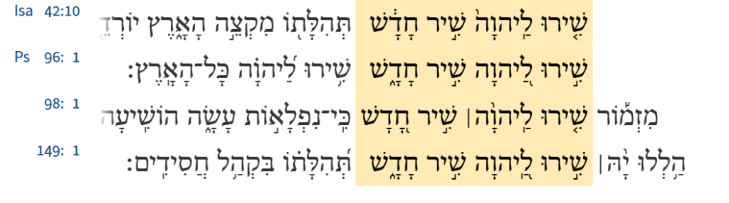 There are three Psalms that start with precisely these words: Tehillim / Psalms 96, 98, and 149, each begin with שִׁ֣ירוּ לַ֭יהוָה שִׁ֣יר חָדָ֑שׁ “sing to the Lord a new song.” In addition to this, Isaiah 42:10 also writes the same saying, שִׁ֣ירוּ לַ֭יהוָה שִׁ֣יר חָדָ֑שׁ “sing to the Lord a new song.” Another Psalm also contains this phrase, Tehillim / Psalms 33:3 שִֽׁירוּ־לֹ֖ו שִׁ֣יר חָדָ֑שׁ הֵיטִ֥יבוּ נַ֝גֵּ֗ן בִּתְרוּעָֽה׃ “Sing unto him a new song; Play skilfully with a loud noise.” Tehillim / Psalm 144:9 אֱֽלֹהִ֗ים שִׁ֣יר חָ֭דָשׁ אָשִׁ֣ירָה לָּ֑ךְ בְּנֵ֥בֶל עָ֝שֹׂ֗ור אֲזַמְּרָה־לָּֽךְ׃ “I will sing a new song unto thee, O God: Upon a psaltery and an instrument of ten strings will I sing praises unto thee.” This idea of singing a new song is how the Psalmist declares the glory and praise of God due to His love, mercy, and salvation that only He can provide. We also find NT texts to this extent, such as in the book of Revelation. (See Revelation 5:9 and 14:3) Tehillim / Psalms 40 provides us some insights saying, ד וַיִּתֵּ֬ן בְּפִ֨י׀ שִׁ֥יר חָדָשׁ֮ תְּהִלָּ֪ה לֵֽאלֹ֫הֵ֥ינוּ יִרְא֣וּ רַבִּ֣ים וְיִירָ֑אוּ וְ֝יִבְטְח֗וּ בַּיהוָֽה׃ 40:3 And he hath put a new song in my mouth, even praise unto our God: Many shall see it, and fear, and shall trust in the LORD. (KJV) Here the Psalmist suggests it is the Lord who places this song in our hearts. To create a new song is to increase faith and to facilitate trusting in the Lord! The idea in these Psalms is related to being delivered by God, and the miracle of God’s mercy upon His people! This is how Isaiah speaks according to the TgJ, א בְעִדָנָא הַהוּא יְשַבְחוּן תוּשבְחָא חְדַתָא בְאַרעָא דְבֵית יְהוּדָה קִריַת תוּקפָא לַנָא פוּרקָן יִתְסָם עַל שוּרַהָא וְרַחְמִין׃ 26:1 AT THAT TIME THEY SHALL SING A NEW SONG IN THE LAND OF THE HOUSE OF JUDAH: We have a strong city, salvation and mercy shall be established upon her walls. (TgJ) Radak interprets this verse in the following way: