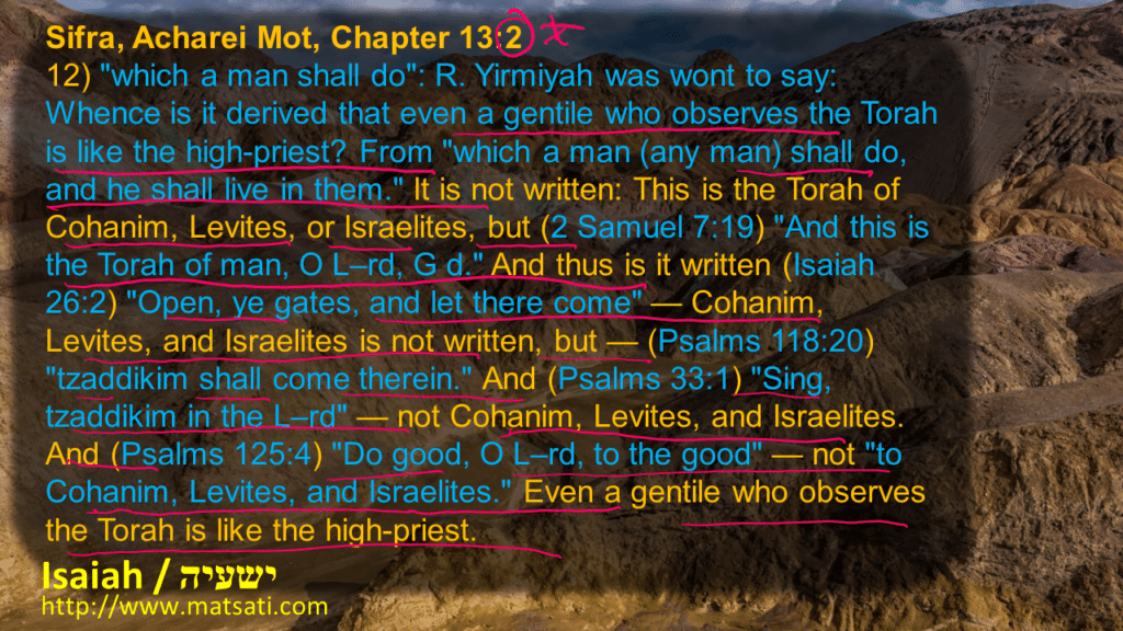 12) “which a man shall do”: R. Yirmiyah was wont to say: Whence is it derived that even a gentile who observes the Torah is like the high-priest? From “which a man (any man) shall do, and he shall live in them.” It is not written: This is the Torah of Cohanim, Levites, or Israelites,” but (2 Samuel 7:19) “And this is the Torah of man, O L–rd, G d.” And thus is it written (Isaiah 26:2) “Open, ye gates, and let there come” — Cohanim, Levites, and Israelites is not written, but — (Psalms 118:20) “tzaddikim shall come therein.” And (Psalms 33:1) “Sing, tzaddikim in the L–rd” — not Cohanim, Levites, and Israelites. And (Psalms 125:4) “Do good, O L–rd, to the good” — not “to Cohanim, Levites, and Israelites.” Even a gentile who observes the Torah is like the high-priest.