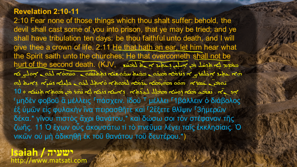 2:10 Fear none of those things which thou shalt suffer: behold, the devil shall cast some of you into prison, that ye may be tried; and ye shall have tribulation ten days: be thou faithful unto death, and I will give thee a crown of life. 2:11 He that hath an ear, let him hear what the Spirit saith unto the churches; He that overcometh shall not be hurt of the second death. (KJV, ܒ݁ܡܶܕܷ݁ܡ ܠܴܐ ܬܷ݁ܕ݂ܚܰܠ ܡܶܢ ܐܱܝܠܷܝܢ ܕܱ݁ܥܬ݂ܻܝܕ݂ ܐܱܢ̄ܬ݁ ܠܡܶܚܰܫ ܂ ܗܳܐ ܥܬ݂ܻܝܕ݂ ܐܴܟ݂ܶܠܩܰܪܨܴܐ ܕ݁ܢܰܪܡܶܐ ܡܶܢܟ݂ܽܘܢ ܒ݁ܒ݂ܶܝܬ݂ ܚܒ݂ܽܘܫܝܳܐ ܕ݁ܬ݂ܷܬ݂ܢܰܣܽܘܢ ܂ ܘܢܶܗܘܶܐ ܠܟ݂ܽܘܢ ܐܾܘܠܨܴܢܳܐ ܝܰܘܡܺܝ̈ܢ ܥܶܣܪܴܐ ܂ ܗܘܰܘ ܡܗܰܝ̈ܡܢܶܐ ܥܕ݂ܰܡܳܐ ܠܡܰܘܬܴ݁ܐ ܘܶܐܬܷ݁ܠ ܠܟ݂ܽܘܢ ܟ݁ܠܻܝܠܴܐ ܕ݁ܚܰܝܷ̈ܐ ܂ܕܻ݁ܐܝܬ݂ ܠܷܗ ܐܷܕ݂ܢܷ̈ܐ ܆ ܢܶܫܡܰܥ ܡܳܢܳܐ ܪܾܘܚܳܐ ܡܡܰܠܷܠ ܠܥܻ̈ܕ݂ܳܬ݂ܴܐ ܂ ܕܱ݁ܐܝܢܳܐ ܕ݁ܙܳܟ݂ܶܐ ܠܴܐ ܢܶܗܰܪ ܡܶܢ ܡܰܘܬܴ݁ܐ ܬܷ݁ܢܝܳܢܳܐ ܀ 10 ⸀μηδὲν φοβοῦ ἃ μέλλεις ⸁πάσχειν. ἰδοὺ ⸆ μέλλει ⸀1βάλλειν ὁ διάβολος ἐξ ὑμῶν εἰς φυλακὴν ἵνα πειρασθῆτε καὶ ⸀2ἕξετε θλῖψιν ⸀3ἡμερῶν δέκα.* γίνου πιστὸς ἄχρι θανάτου,* καὶ δώσω σοι τὸν στέφανον τῆς ζωῆς. 11 Ὁ ἔχων οὖς ἀκουσάτω τί τὸ πνεῦμα λέγει ταῖς ἐκκλησίαις. Ὁ νικῶν οὐ μὴ ἀδικηθῇ ἐκ τοῦ θανάτου τοῦ δευτέρου.*)