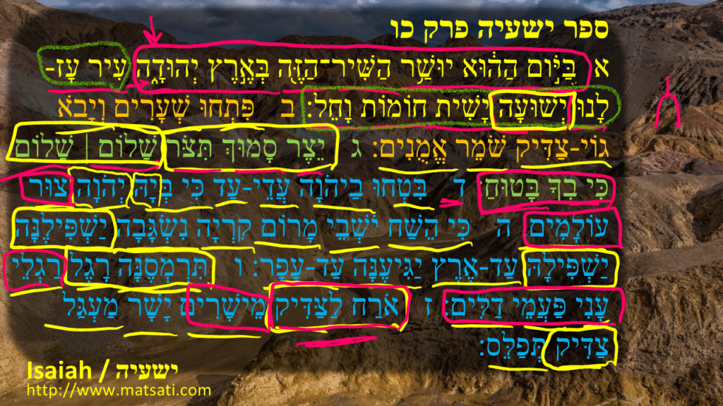 א בַּיּוֹם הַהוּא יוּשַׁר הַשִּׁיר-הַזֶּה בְּאֶרֶץ יְהוּדָה עִיר עָז-לָנוּ יְשׁוּעָה יָשִׁית חוֹמוֹת וָחֵל: